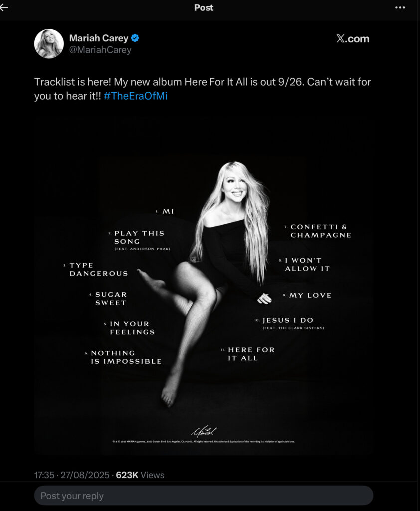 Multiple award winning musician Mariah Carey has unveiled the tracklist for her upcoming album titled ‘Here For It All” which is set to be released on 09/26 . The music star shared the artwork of the tracklist on her X page.