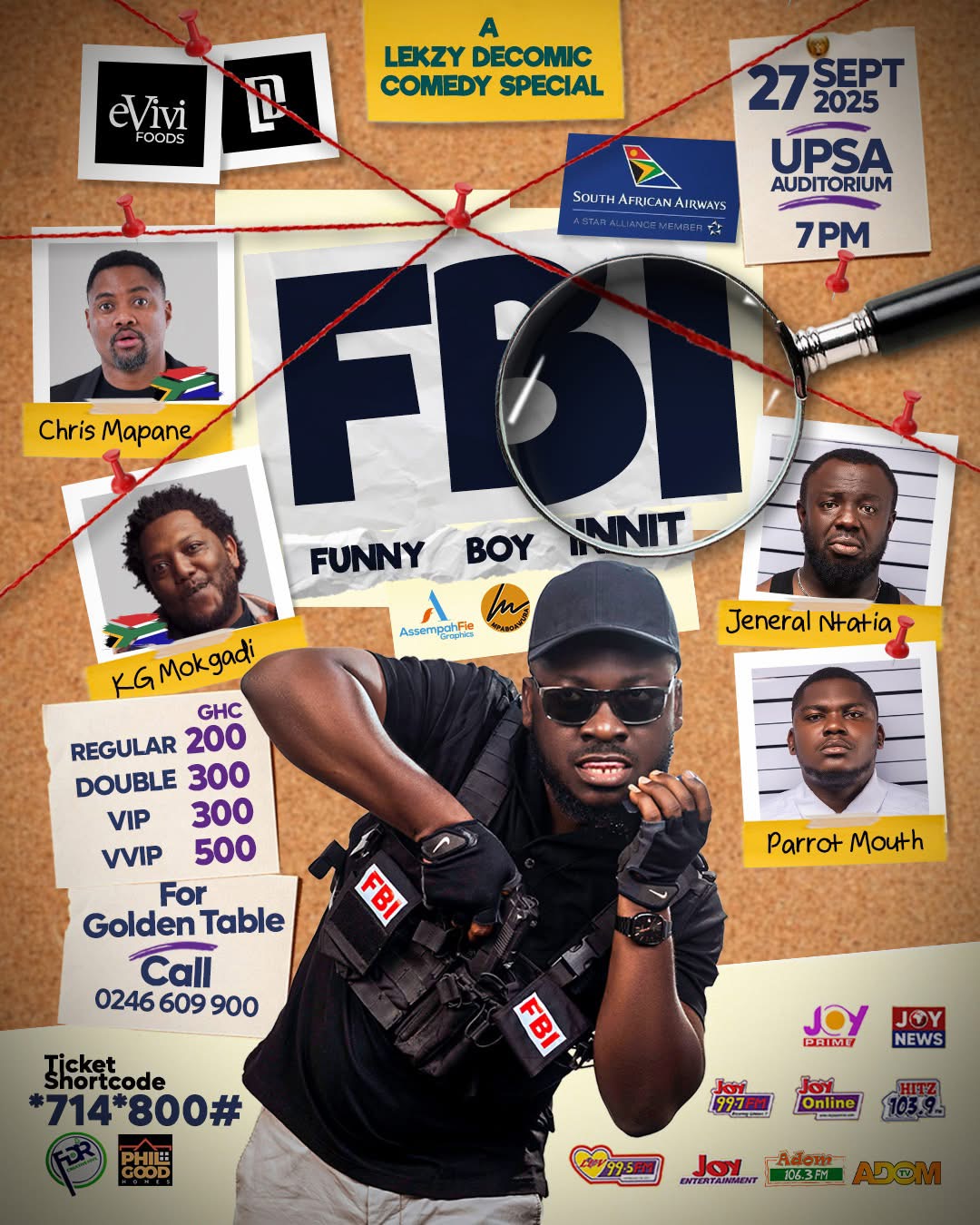 Ghanaian comedian Lekzy DeComic will headline a major comedy event, “Funny Boy Innit” (FBI), on Saturday, 27th September 2025 at the UPSA Auditorium in Accra, featuring two of South Africa’s biggest comedy names, Chris Mapane and KG Mokgadi.